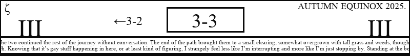 King’s Chatroom: I mark you will be very pleased, o king. This new technology arrived from the mouse kingdom just two nights ago. It has taken some setting up, but works exactly as they have said. Sun God: Johnny came in in the passenger seat, seatbelt on, as Kasston was in the driver’s seat telling a story. Telltales: “That shouldn’t matter... but... I’ve been surprised before.” As they got deeper and deeper into the humid, hot, black-leaf forests of Mu’siir, the telltales became decreasingly forthcoming. Characters: Some characters. Poems: Black; Q+A; Darker Grey. ζ |
