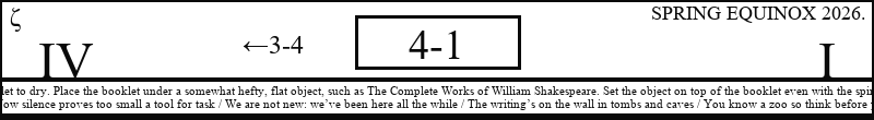 Yeoman Kit Colony: Everything feels like dog. I’m in bed, in a perfectly dark room: my only available senses are smell, sound, touch, taste, gravity, and time. Arbitration: Bryce and Mateo, the prosecuting attorneys, are sitting in an office together, looking at a few items of discovery material. Poems: From Yapping With A Friend One Night; Two brief things from two different old notebooks; Onward. ζ |